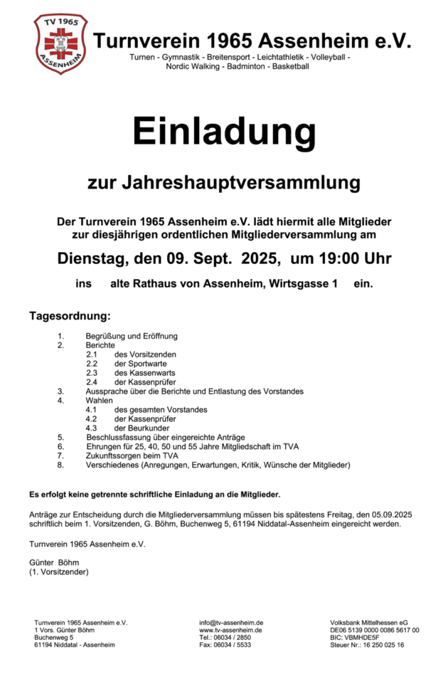 Der Vorstand des Turnverein 1965 Assenheim e.V. lädt alle seine Mitglieder zur diesjährigen Jahreshauptversammlung ein.